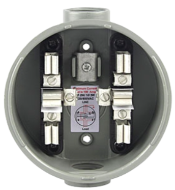 Feature: • 100Amps,120/240V AC,Single phase,4 terminals,2 or 3 wires, • Comply with ANSI C12.7 • line and load lugs: 1/0 max Cu-Al • Interior: Units are supplied with four terminals • Mounting: Surface, pole outdoor, NEMA3R • Hub or hub plate: fixed, top and bottom • Locking: sealing ring has lock provision