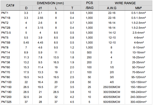 Size: PNT1 to PNT325