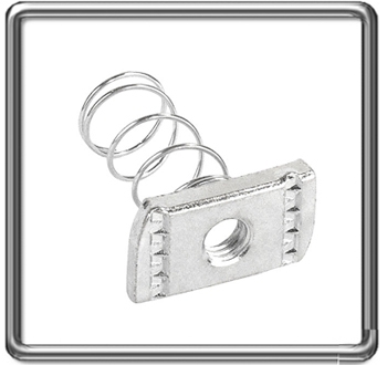 Spring nuts are inserted inside strut channel to accept threaded fasteners or bolts.